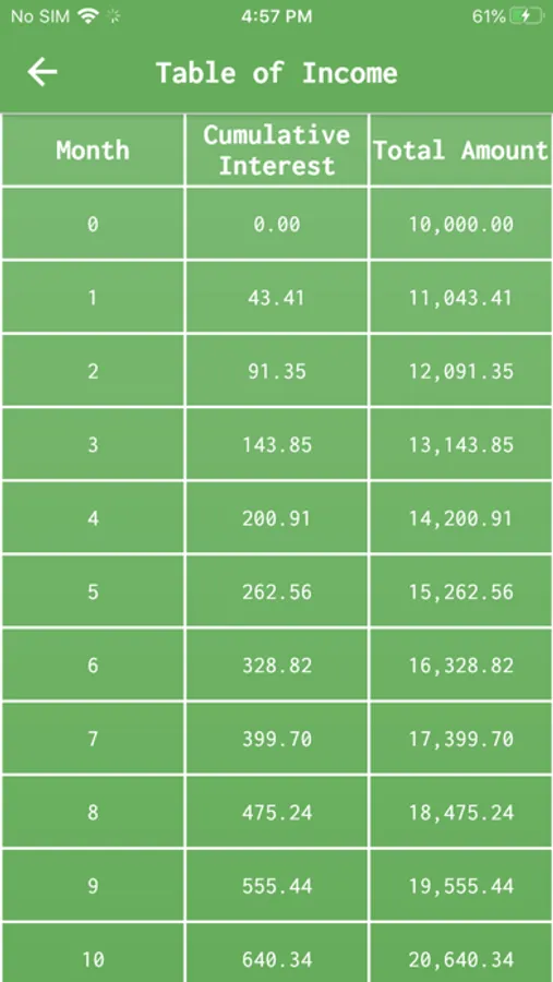 The application also provides an income table, where it is possible to check, month by month, the evolution of investments and the interest accumulated during the period.