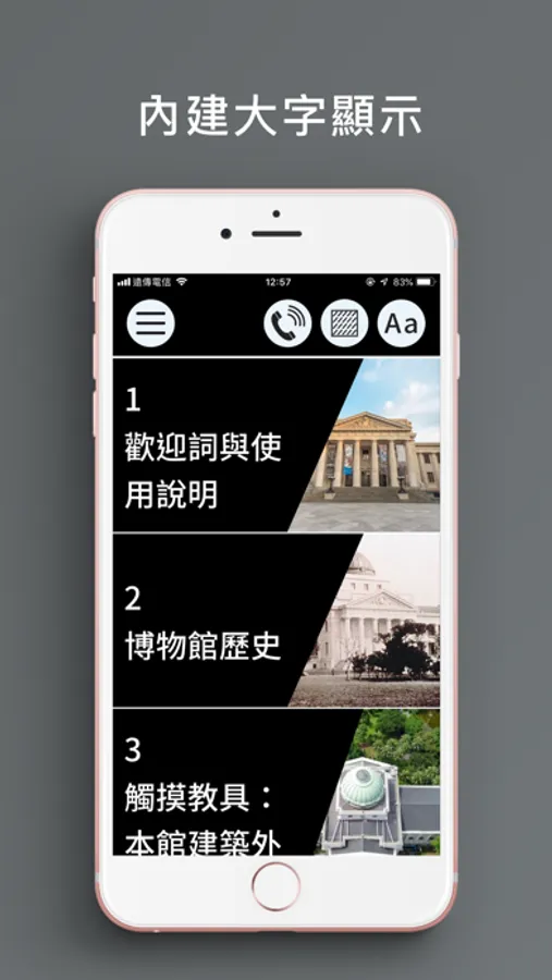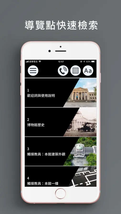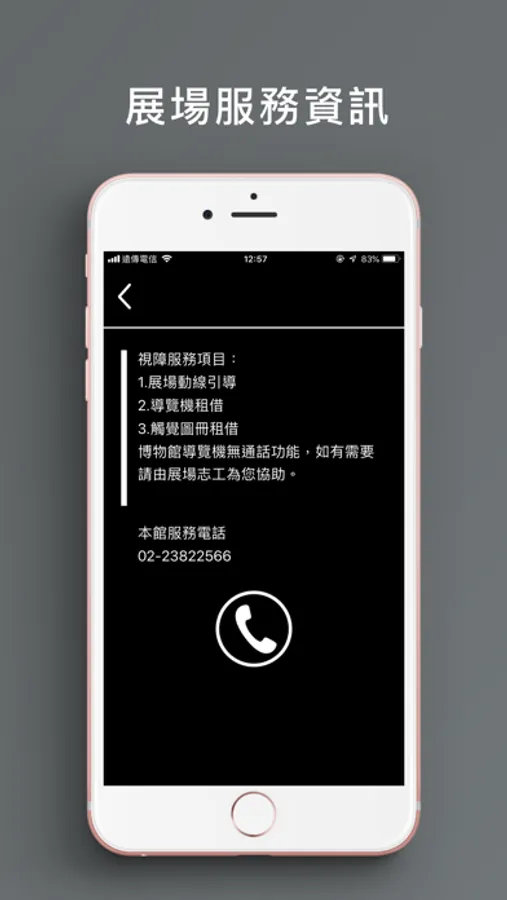 本服務支援語音朗讀(旁白)功能,內容包含臺博館簡介、臺博館本館及鐵道部園區館舍介紹、常設展口述影像語音導覽。
