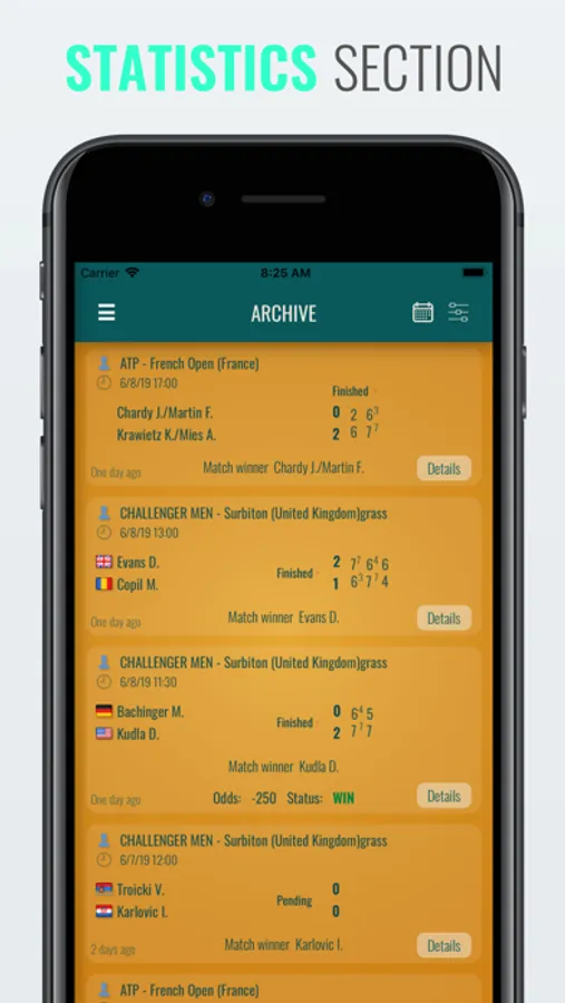 Every match has information about home and away player/team, tournament type, local start date and time, match status, match results, type of the tip, publish date and time. Current/recap status of the prediction (Win/Lose) can be viewed by tapping on the details button.