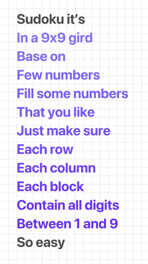 Sudoku is such a deceptively simple puzzle: the challenge can be expressed in one sentence. Given a puzzle in 9x9 box with few known numbers, try and fill in the remaining squares with numbers 1 to 9 such that each row, column and 3x3 box contain all the numbers 1 to 9 without duplication.