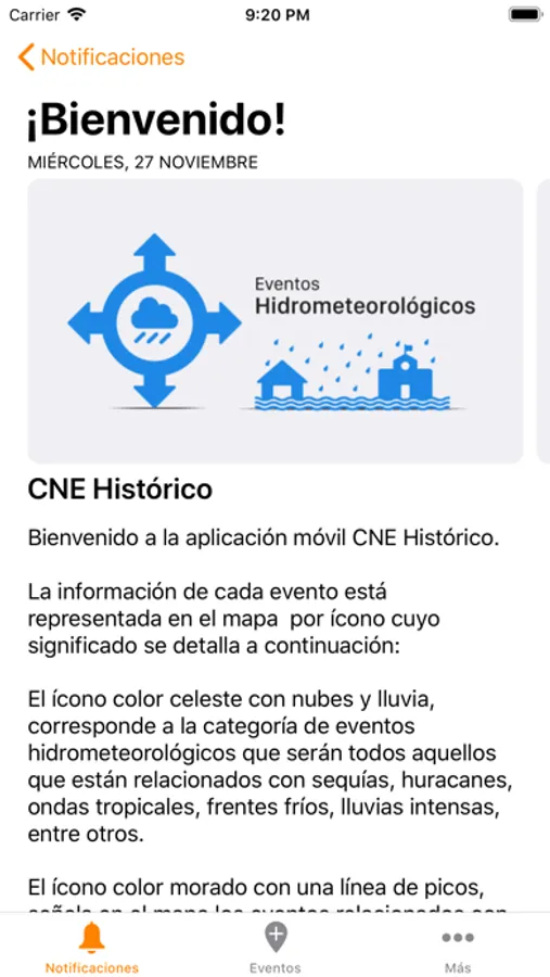 La aplicación muestra para cada evento, una especie de ficha técnica donde se presenta la información histórica del lugar y año en que ocurrió, localización, tipo y nombre, una breve descripción del evento y la o las fuentes bibliográficas consultadas. App CNE eventos históricos no es un compendio de pérdidas económicas, ni pretende incluir indicadores económicos, pero si la referencia de algunos de los eventos históricos ocurridos en el territorio nacional y así evidenciar de alguna manera la situación de vulnerabilidad del país.