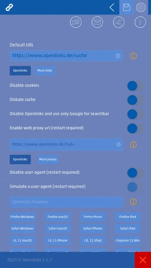 Open links or keywords with the Openlinks browser. Add a link in the settings. The preferred URL is called up each time it is started. Make further settings such as cockies, cache, user agent etc. The Openlinks browser was developed to call up links and URLs without cacher, without cookies and without or simulated user agent identification or so that the current information is always displayed with every call. If required, without cache, without cookies, no or simulated user agent identification, no analytics, fast page loading, easy to use and full anonymous. Adaptation of the user-agent and proxy connection for secure web access.