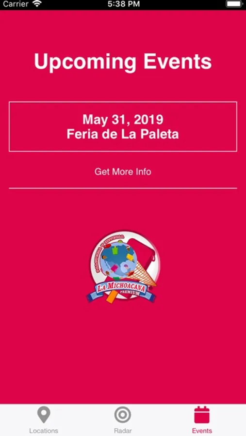 La Michoacana Premium Application. Displays Menu, Locations, and Upcoming Events.