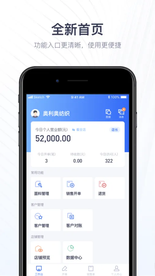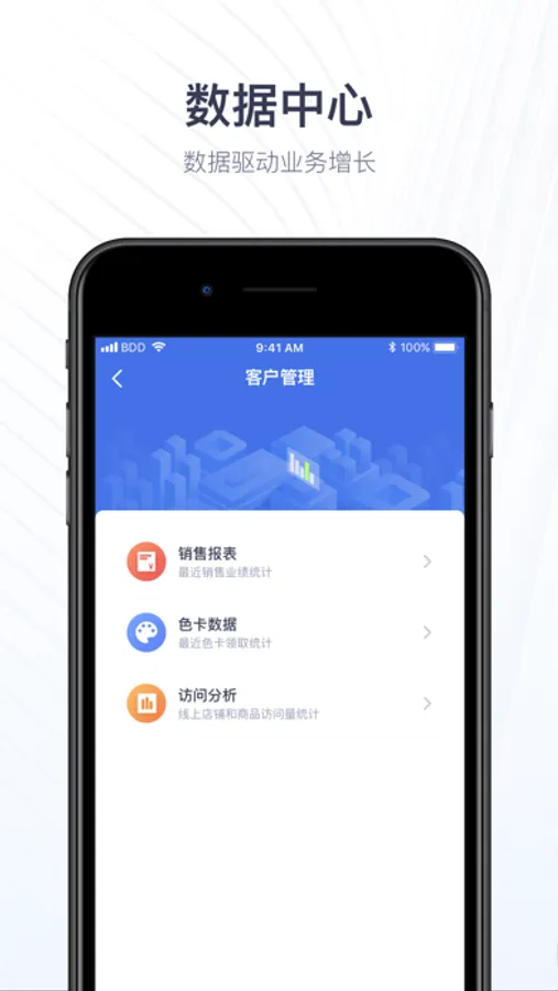 App提供多种数据报表,帮助商家掌握店铺经营数据,每日销售情况,哪些色卡领取得多,线上店铺和商品访问统计,客户欠款统计等,一目了然,通过经营数据高效驱动业务增长。