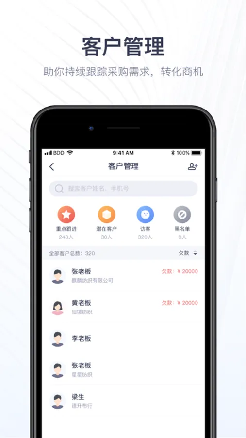 ②功能强大:满足不同规模的布行进行面料,订单,客户,员工和数据管理的需求。是最懂布行管理的App。
