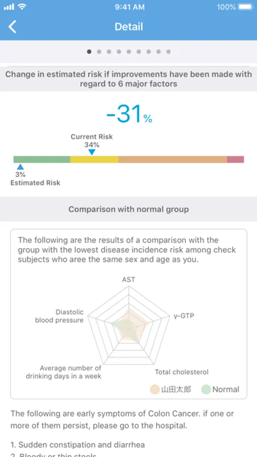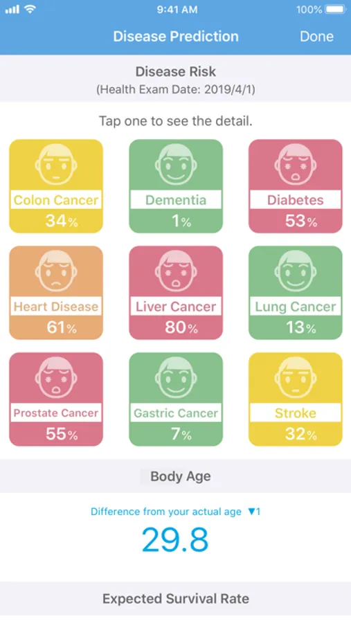 Besides 10 diseases prediction, you can also check your biological age, survival rate of next 10 years, advice on health care, suggestion about additional health check, a comparison of your data and others’ data in your group.