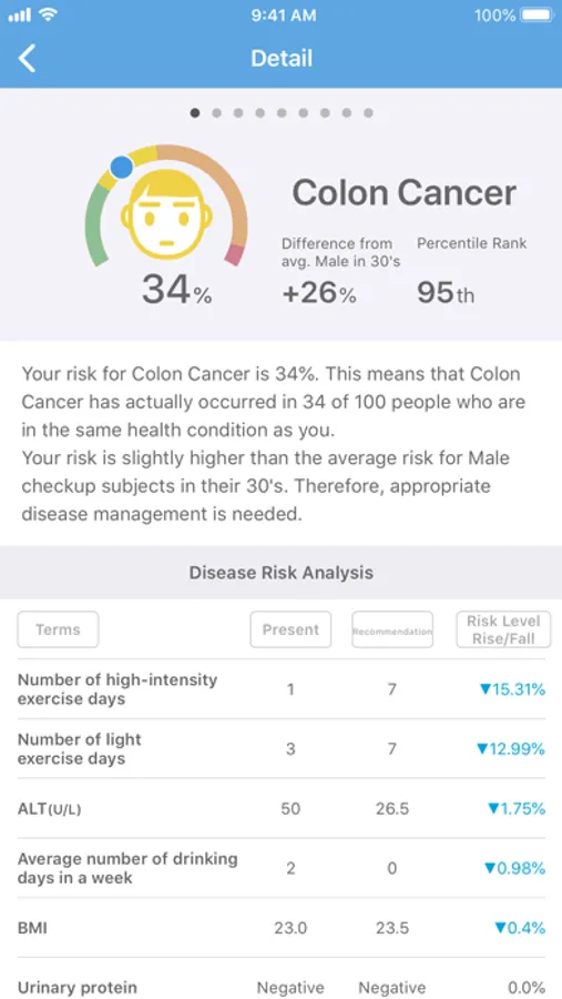 -Based on the health check result, it predicts 10 diseases occurrence probability such as breast cancer or colorectal cancer etc-