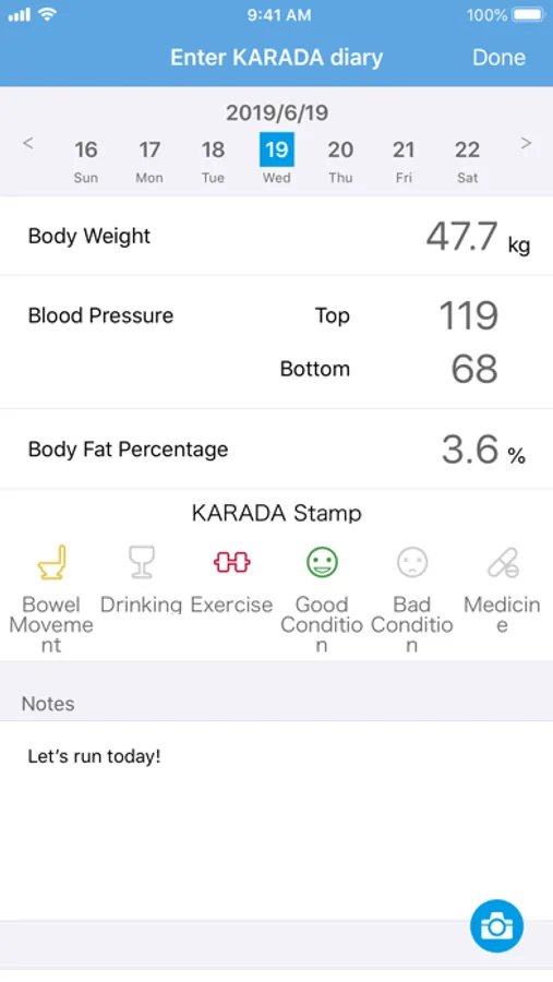 Weight, BMI, body fat percentage, Blood pressure, Alcohol taking, bowel movement and other memos and photos can be recorded.