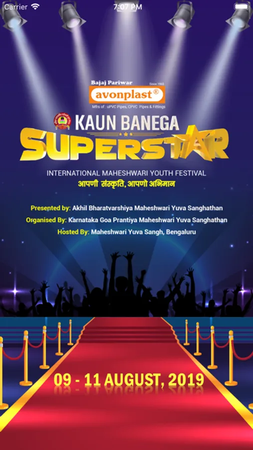 Avonplast Kaun Banega Superstar is an International Maheshwari Youth Festival presented by - Akhil Bharatvarshiya Maheshwari Yuva Sanghathan, Organised by Karnataka Goa Prantiya Maheshwari Yuva Sanghatan and hosted by Maheshwari Yuva Sangh, Bangalore. It is scheduled to be organised at “Manpho Convention centre, on 9-10-11 of August 2019, at Bangalore, Karnataka”