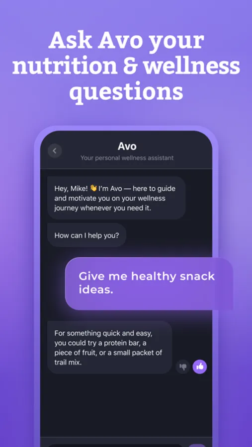 • Avo, your personal wellness assistant, available to answer your nutrition and wellness questions 24/7