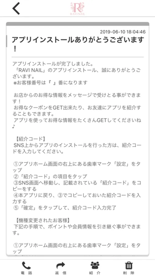 RAVINAILのアプリをSNSを通じてお友達に紹介する事ができます。