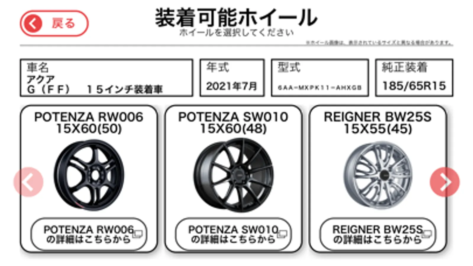 当アプリで使用しているマッチングデータは、弊社にて足回り調査を実施した車両と下記オリジナルアルミホイールについて、ホイール単体での装着参考例を掲載したものです。