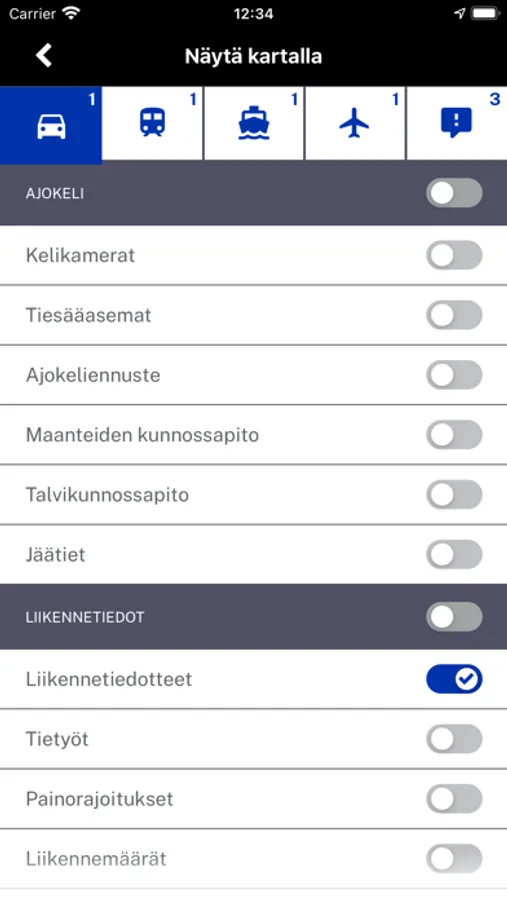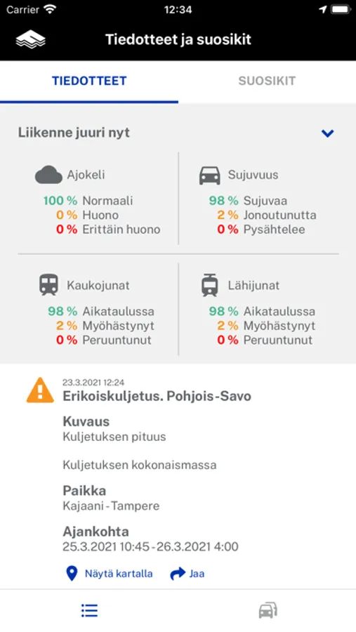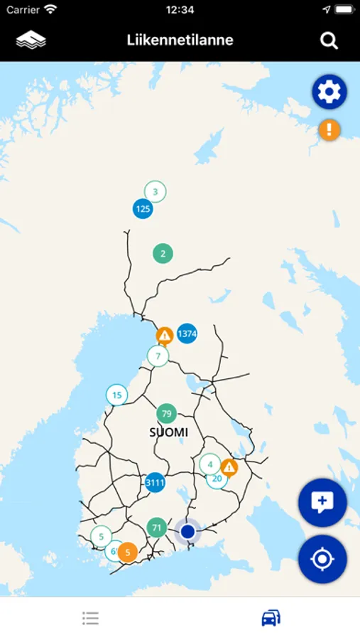 Liikennetilanne -sovellus esittää Fintrafficin, Väyläviraston sekä Liikenne- ja viestintäviraston (Traficom) keräämiä tietoja tie-, meri- ja rautatieliikenteestä.