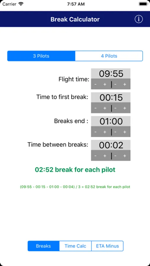 - Breaks: it will calculate pilot rest breaks for 3 and 4 pilot crews.