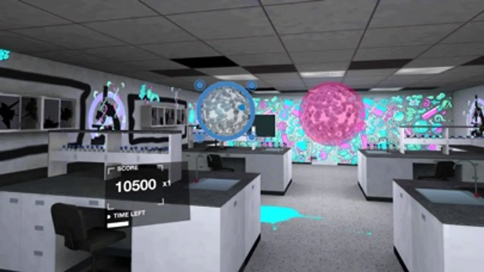 Your mission as a Cell Biology specialist, is to enter each contaminated lab and complete organoid training modules left by lab management. After the training modules, you will identify and zap any bad organoid cultures using the supplied equipment.