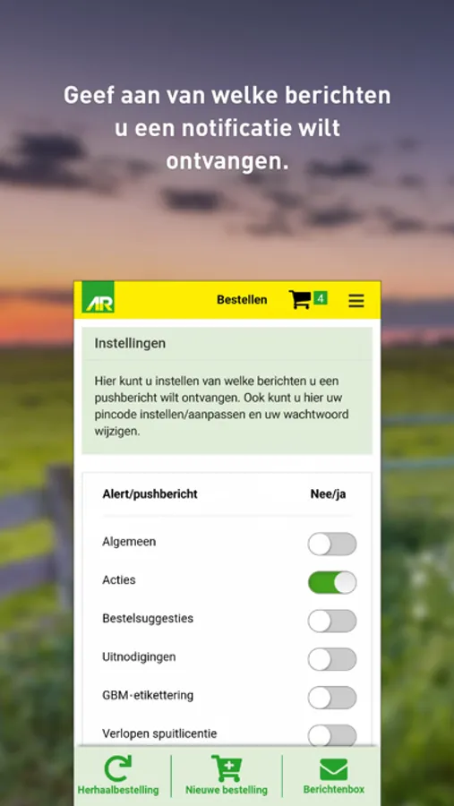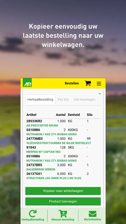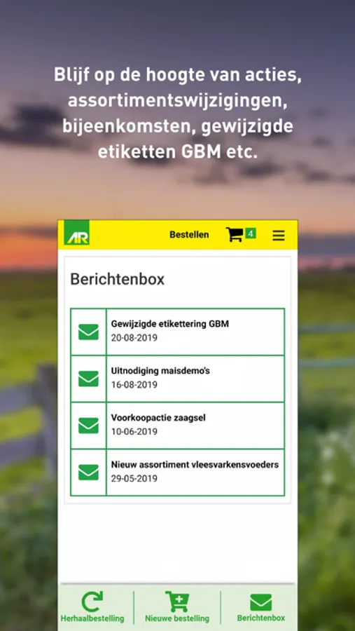Via Mijn AR kunt u eenvoudig en snel bestellingen plaatsen, bestelhistorie inzien, facturen en mineralenoverzichten opvragen. Via de Berichtenbox blijft u op de hoogte van assortimentswijzigingen, verkoopacties, AR-bijeenkomsten, verlopen spuitlicentie.