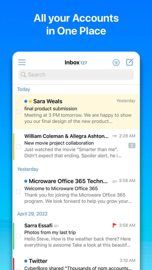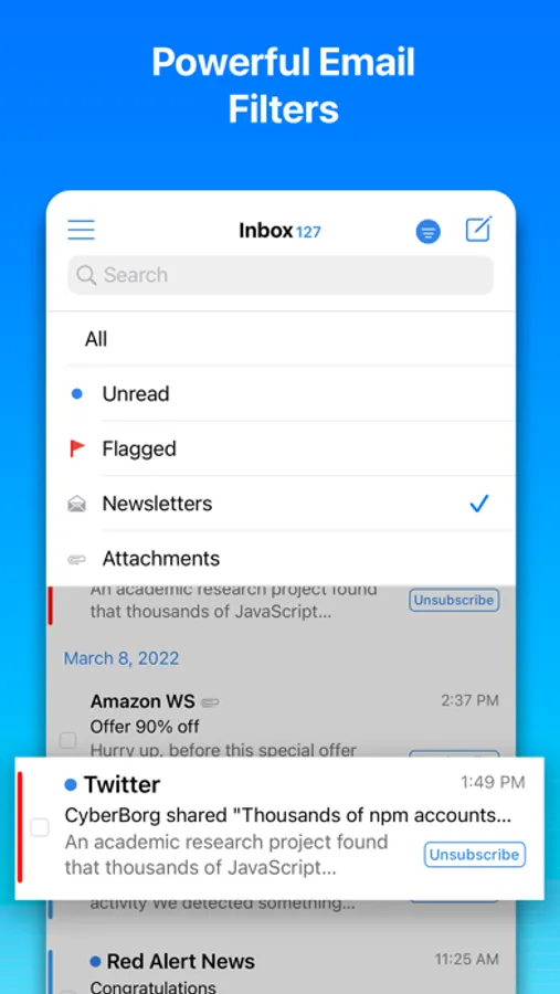 - Easy filter you inbox by categories like Unread, Newsletters, emails with attachments...
