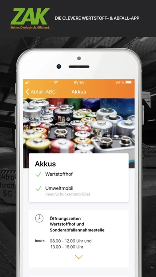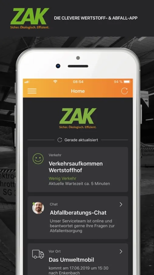 In Sachen Abfall auf ZAK sein – und sich bereits vor der Abfahrt über die Wartezeiten am Wertstoffhof informieren, sich automatisch an den nächsten Stopp des Umweltmobils erinnern lassen und im Abfall-ABC nachlesen, wie die verschiedenen Abfälle richtig entsorgt werden. Wer dann immer noch Fragen hat, schaltet sich live in den Chat zu unseren Mitarbeitern.