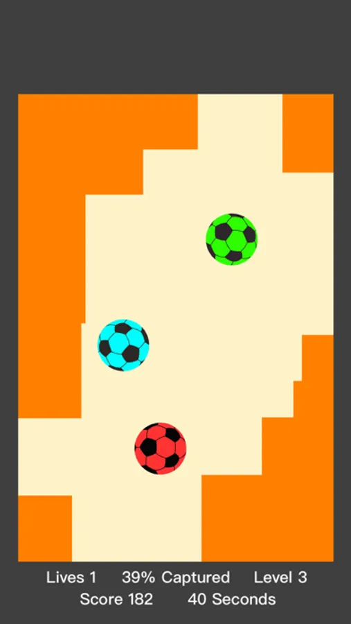 Fill up at least 75 percent of the space with rectangles. Slide your finger in the direction you want the shape to grow. An outline of the shape will show. Once your touch ends the outline will be filled. If the balls touch the rectangle while it is growing a life will be lost. Shapes can overlap. With each level you get more time and lives to fill the space. With each level the balls increase in number and get smaller.