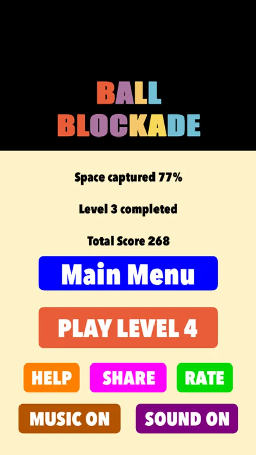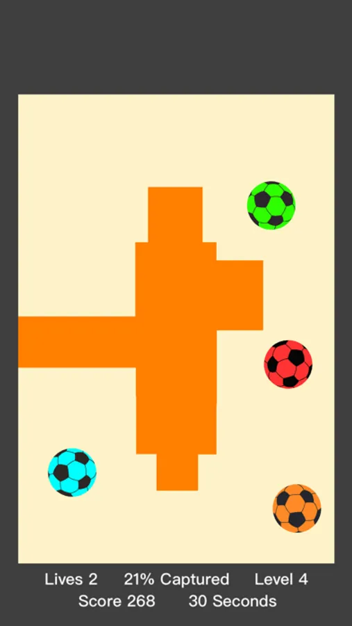 As the game progresses your best strategy is to place smaller shapes down and build onto them. Divide and conquer is the best way to give yourself a chance to beat the count down. You can delay the filling by keeping your finger on the screen until any balls nearby pass through the outline or move away. Points are based on time left plus space conquered over 75 percent and lives not used.
