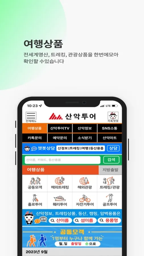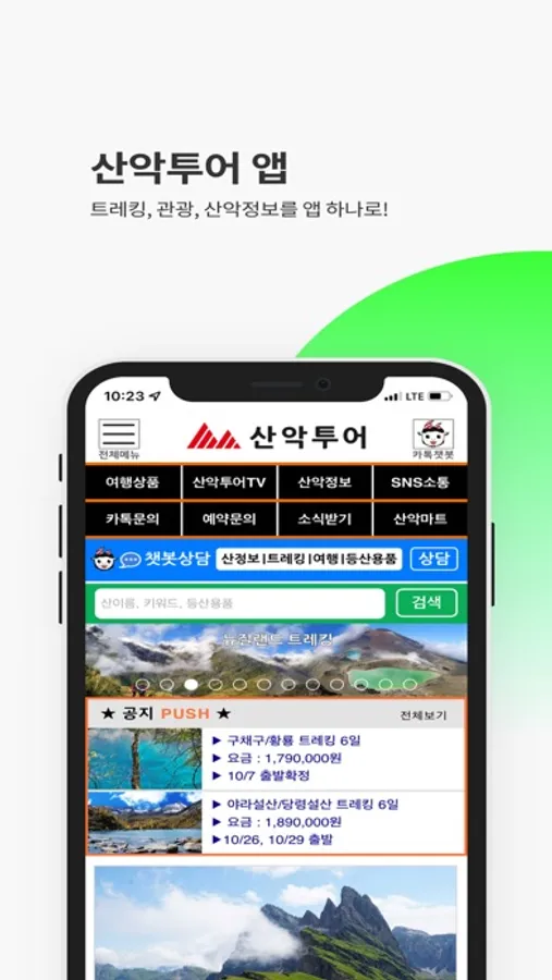 3) 산악투어 앱에서 전 세계 및 국내의 산악여행상품, 트레킹 상품을 보실 수 있습니다.
