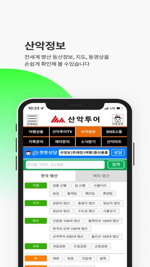 1) 산악투어 앱에서 전세계 및 국내 산악정보, 트레킹 정보를 보실 수 있습니다.