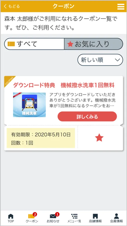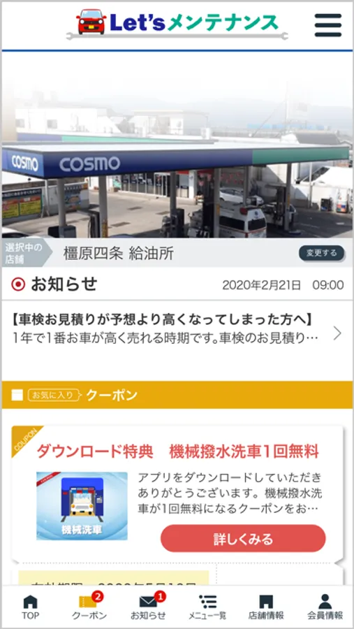 当社のアプリ「森本石油 MyCar手帳」ではアプリで簡単に洗車・コーティングなどのご予約や愛車のメンテナンス管理が可能の他、ご登録いただいた店舗で利用いただけるお得なクーポンや各種メニューの割引情報を配信しております。