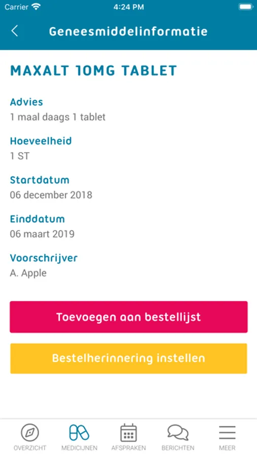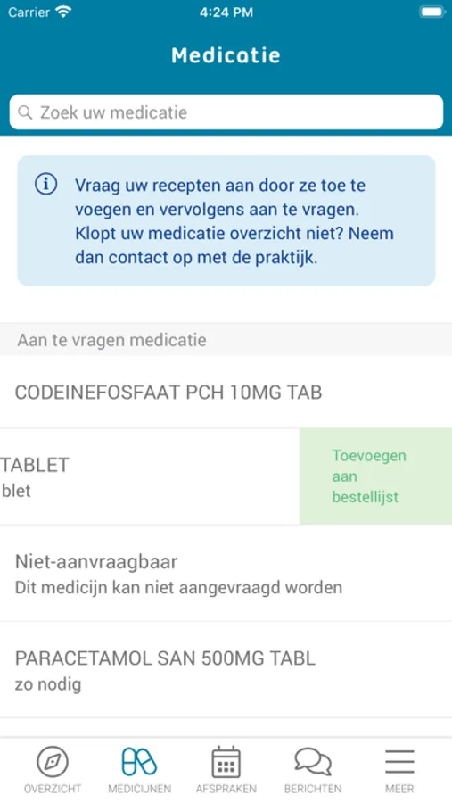 • Vraag herhaalrecepten direct uit uw medicatielijst aan en ontvang herinneringen indien u uw medicatie opnieuw nodig heeft.