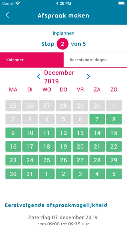 • Bekijk de lege plekken in de agenda van uw arts en boek een afspraak op het moment dat het u uitkomt. U moet tevens de reden van uw afspraak vermelden.