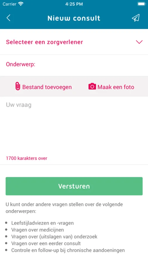 • Stel uw medische vragen direct aan uw arts via een eConsult en ontvang bericht zodra uw consult beantwoord is. Let op! eConsult is niet bedoeld voor urgente zaken of levensbedreigende situaties. Indien u twijfelt over de ernst van uw klacht, neem dan altijd telefonisch contact met de huisarts op.