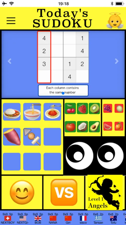 Sudoku for kids with 3 sizes of puzzles (4×4, 6×6 and 9×9). Start playing from level 1 as "simple", and gradually steps up "easy", "medium", "difficult", and "hardest", until level 18. As well as grasping technique behind Sudoku, kids can quest for 18 angel stamps clearing each level. In addition, we have "Daily Challenge Puzzle" which can also quest and collect smiley emoji stamps every day.