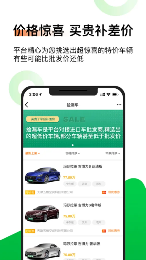 5D好车,专为保障消费者而成立的进口车导购平台,港口专业从事进口车批发20年! 严选车源:保障买车消费者权益,购车如遇问题,优先赔付; 捡漏车源:精选批发商和经销商的特价车,买贵了平台补差价; 超值团购:对接源头批发商、主机厂,定期举办超值团购会; 在线看车:足不出户,手机邀约经销商开启直播一对一讲车,看好了再去展厅买。 5D好车为购买进口车的消费者提供贴身的保障,让消费者放心、安心、开心购买。