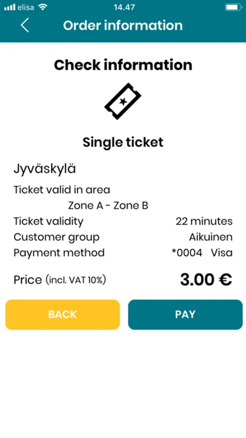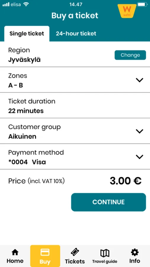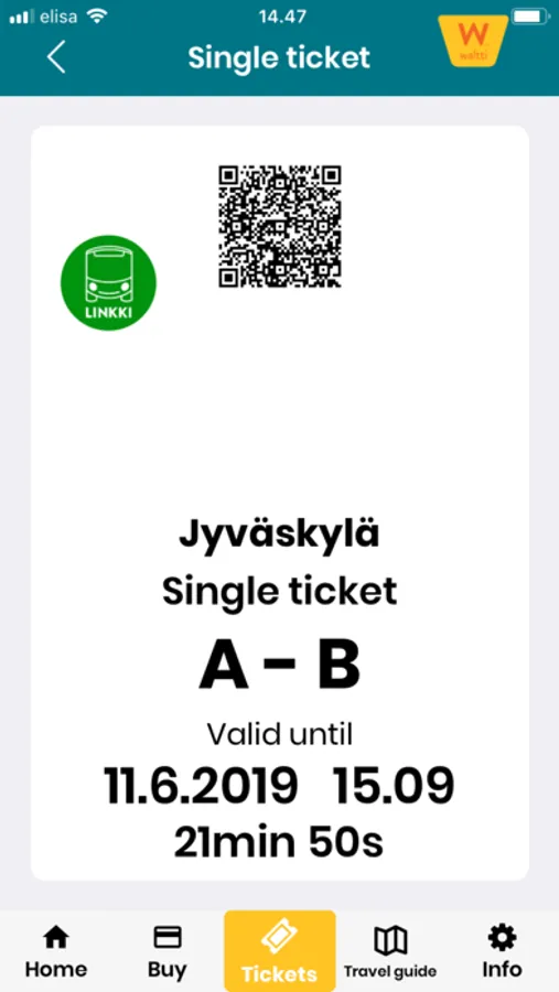 Waltti Mobile tickets are accepted:Salo, Kajaani, Jyväskylä, Vaasa, Hämeenlinna, Oulu, Joensuu, Kymenlaakso, Kouvola , Kotka, Rovaniemi, Mikkeli, Kuopio, Pori and Raasepori.