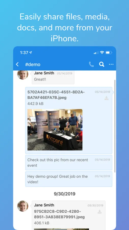• Share files, photos, docs, links, and more from within the app