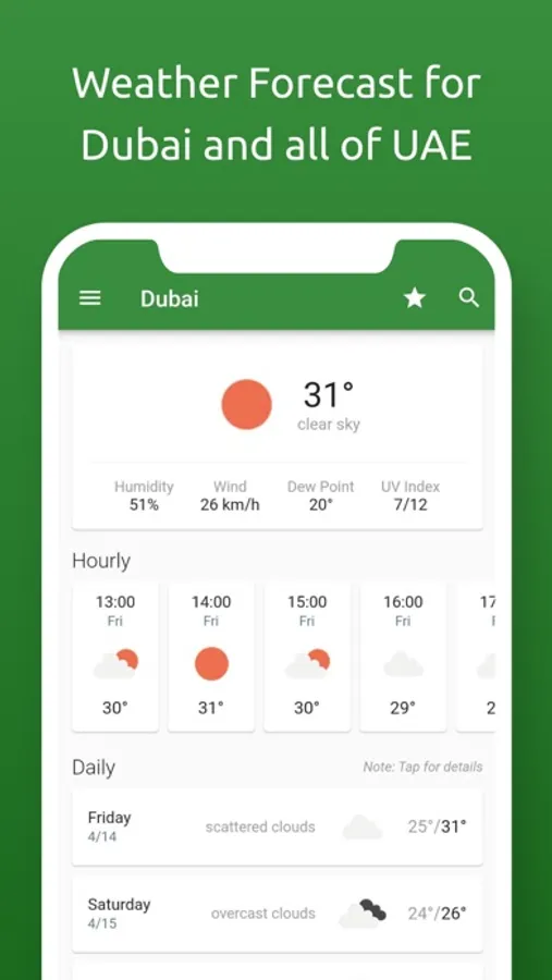 In case you are looking for a simple, yet effective and very accurate weather forecast app within Dubai (and all of UAE) look no further! The "Dubai-Weather" app has all the prerequisites to be your companion while you plan your day ahead and then enjoy lots of sunny days that the UAE offer.