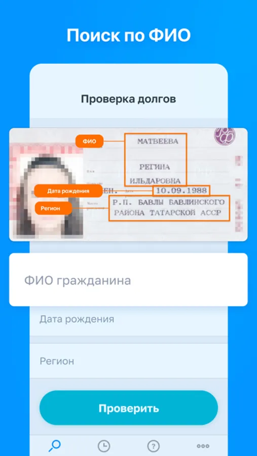 После осуществления проверки на наличие задолженностей ФССП в приложении, данные для проверки сохраняются во вкладке "Проверка долгов", в разделе "Проверенные ранее".