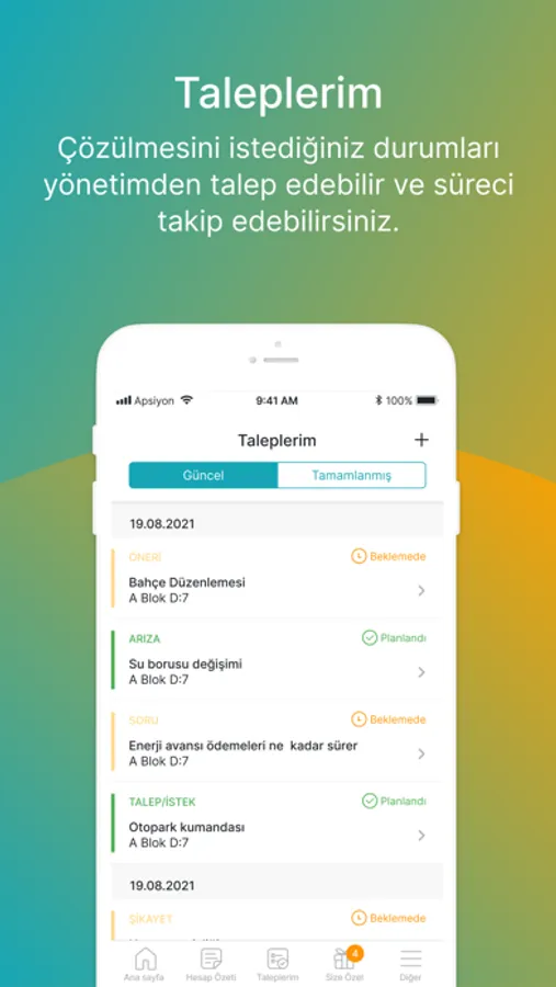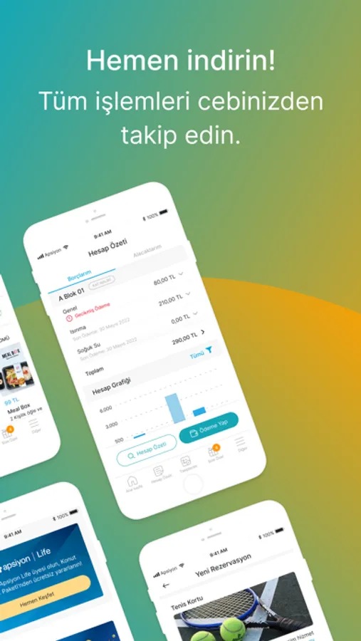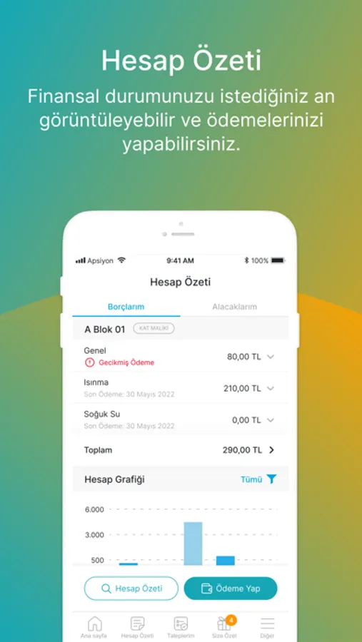Dairenizin ve kiracılarınızın aidat, ısınma, sıcak / soğuk su, ortak alan elektrik / su ödemeleri, demirbaş ödemelerini ve finansal durumunu istediğiniz an telefonunuzdan veya tabletinizden görüntüleyebilir ve dilerseniz aidatınızı online kredi kartı / banka kartınız ile ödeyebilir, makbuz ve hesap ekstrelerinizi kolaylıkla görüntüleyebilirsiniz.