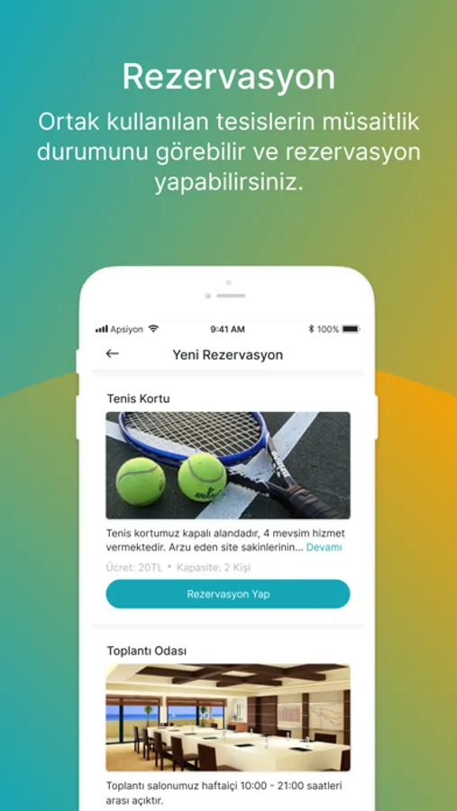 Tenis kortu, havuz, sauna ve spor salonu gibi ortak kullanılan tesislerin müsaitlik durumunu görebilir ve rezervasyon yapabilirsiniz.