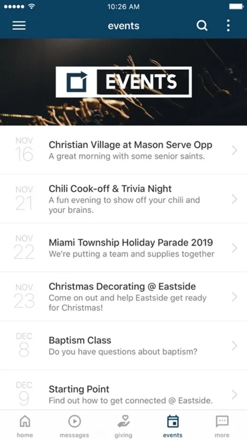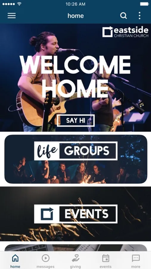 Welcome to the official Eastside Christian Church app. Keep up with message series, register for events, give and much more - all without leaving the Eastside app. So take a look around. We can't wait to see you for one of our weekend worship experiences some time soon!