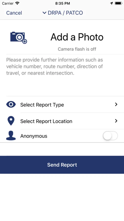 * The Report a Problem button allows users to send incident reports directly. To ensure discretion, the camera flash is automatically disabled when photos are taken through the app. App users may also send reports anonymously if they chose.