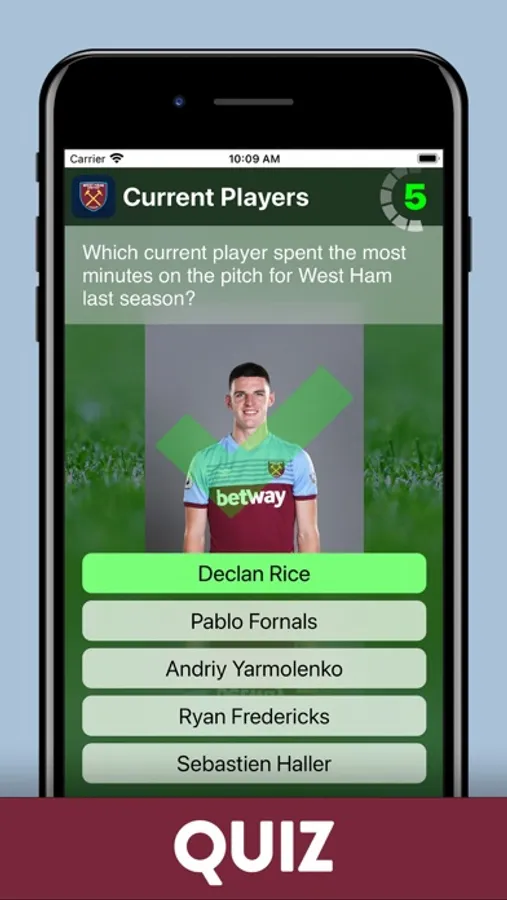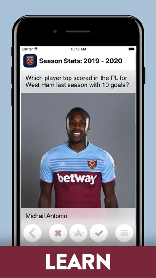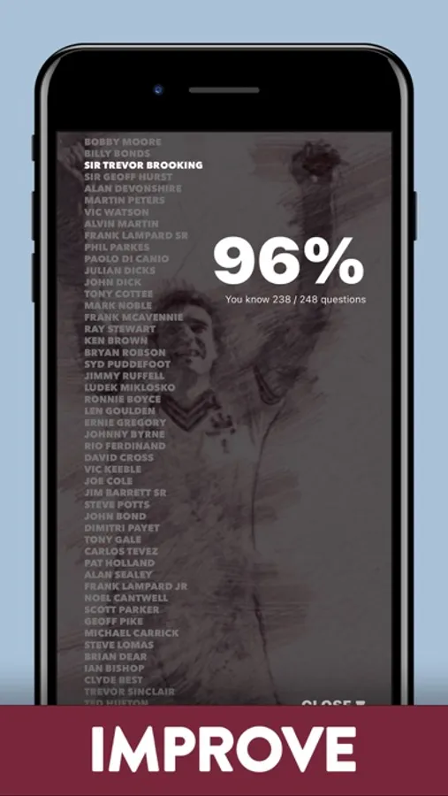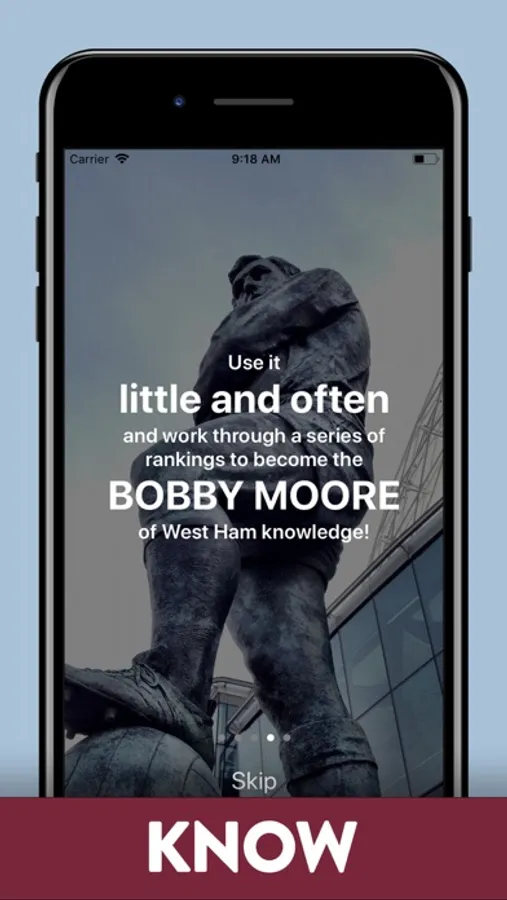 Use the app little and often, and progress through a series of rankings to become the Bobby Moore of West Ham Knowledge. Complete the App and your knowledge of WHUFC will be outstanding, you'll know all the players, new signings, club history, legends, opponents, stadiums and the like.
