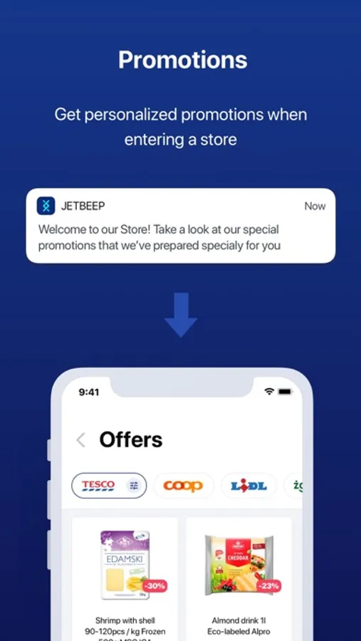 JetBeep mobile application substitutes plastic loyalty cards and irrelevant promotions, which people receive in the wrong place and at the wrong time. At the entrance to the store, covered with our device, JetBeep will send you a single push notification with personalized promotions tailored specially for you. At the checkout, you can seamlessly transfer your loyalty card by tapping our device and all your coupons and discounts will automatically apply.