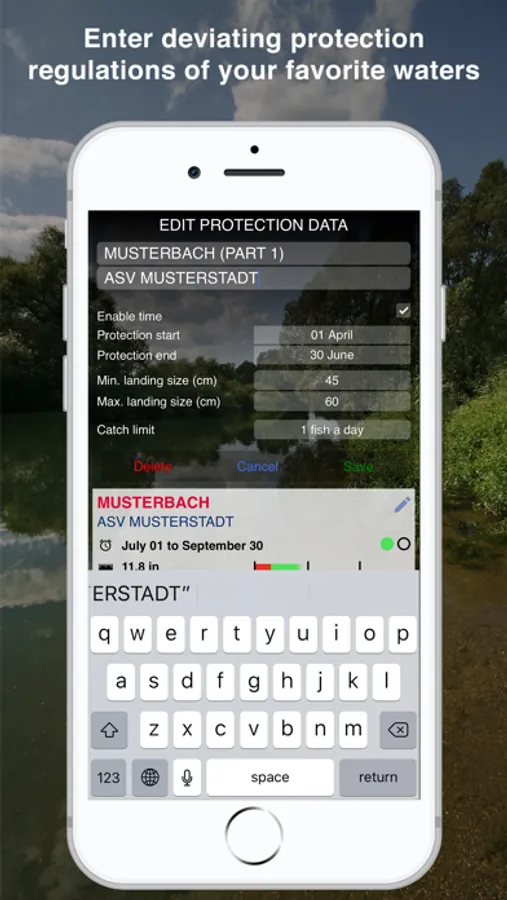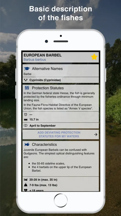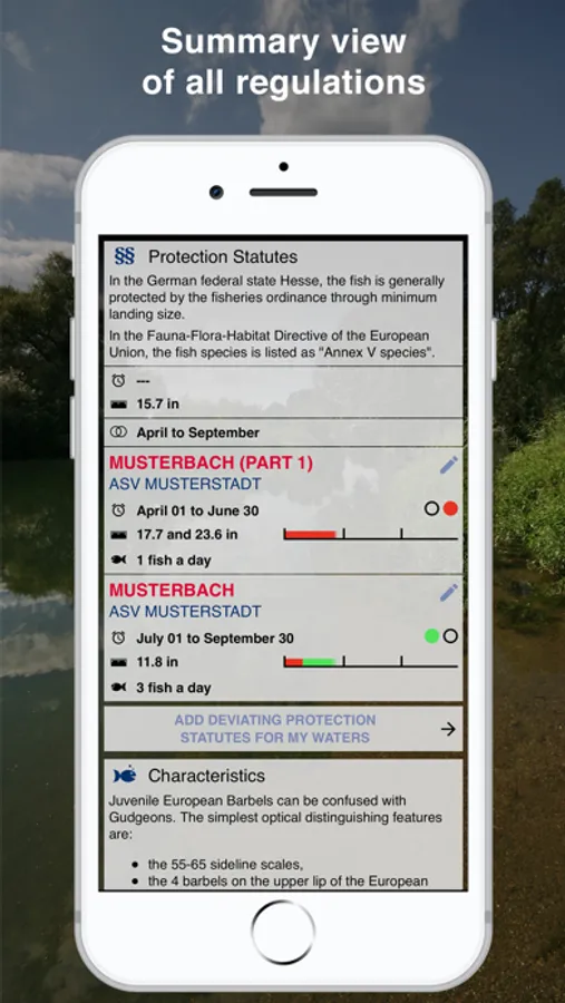 Each fisherman can additionally and individually enter and compile the relevant closed seasons, protection measures as well as catch limits of his target fish. Especially for the waters of own choice, own club, own home water...