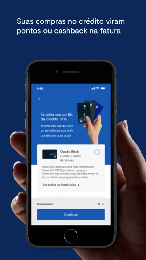 Com o cartão de crédito BTG Pactual, você tem liberdade para escolher seus benefícios. Na opção de cartão de crédito Avançada, você conta com benefícios como seguro-viagem e ainda pode escolher entre os benefícios cashback na fatura ou programa de pontos.