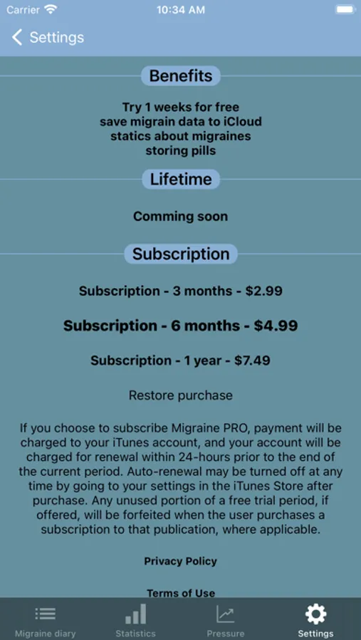If you choose to subscribe Migraine PRO, payment will be charged to your iTunes account, and your account will be charged for renewal within 24-hours prior to the end of the current period. Auto-renewal may be turned off at any time by going to your settings in the iTunes Store after purchase. Any unused portion of a free trial period, if offered, will be forfeited when the user purchases a subscription to that publication, where applicable.
