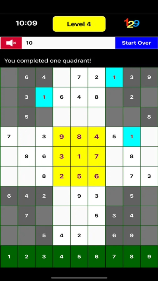 Furthermore, to make games even more interesting, users may choose if there is a time limit or no time limit set for each game. Also, you may turn-on/off sound effects that are used to alert users when they have completed one row, one column, one quadrant, the entire game or time has expired. Finally, after a game is completed, the app will display game statistics and compare that to any of your past best game results for the same game level. This aids you to gauge your progress in improving game solving skills.