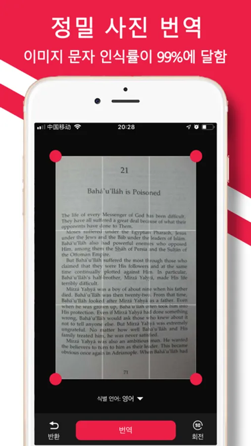카메라로 사진이나 텍스트를 번역하십시오. 인쇄된 모든 출처를 찍으면 번역왕이 즉시 번역한다. 메뉴, 표지, 지도 또는 어떤 종이 문서도 쉽게 번역할 수 있다.