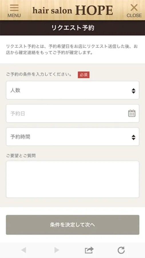 希望の人数・日時を指定して送信するだけで予約を依頼できます。