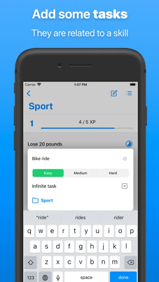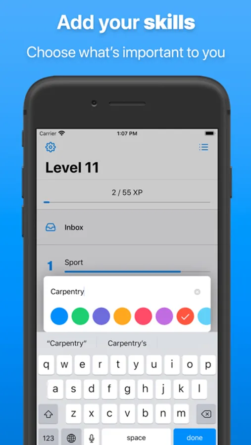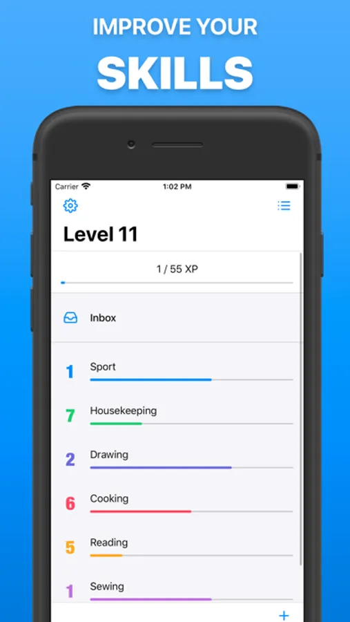 Just add the skills you love and their associated tasks. Each time you complete one of those tasks, your overall level and your skill’s level increase. You then have at all times a clear and motivating vision of the state of your skills.