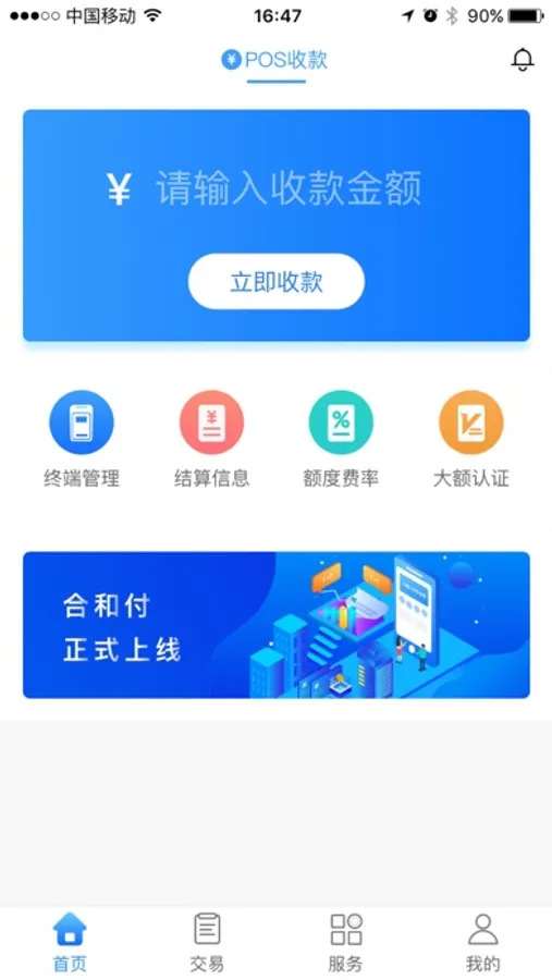 合和付是一款创新型收款APP,主要满足商户随时随地进行收款,配合POS终端,为商户提供POS收款、余额查询等服务。 主要功能:POS收款、交易查询、结算查询、额度费率查询、终端绑定、大额认证、变更结算卡等服务